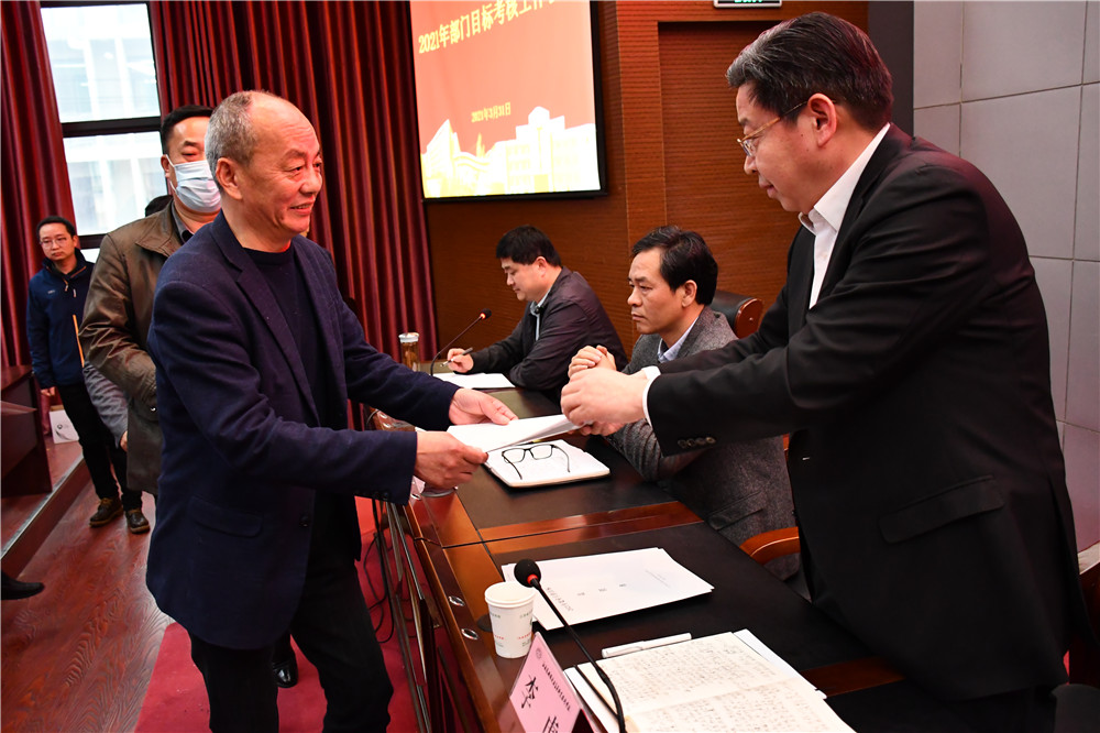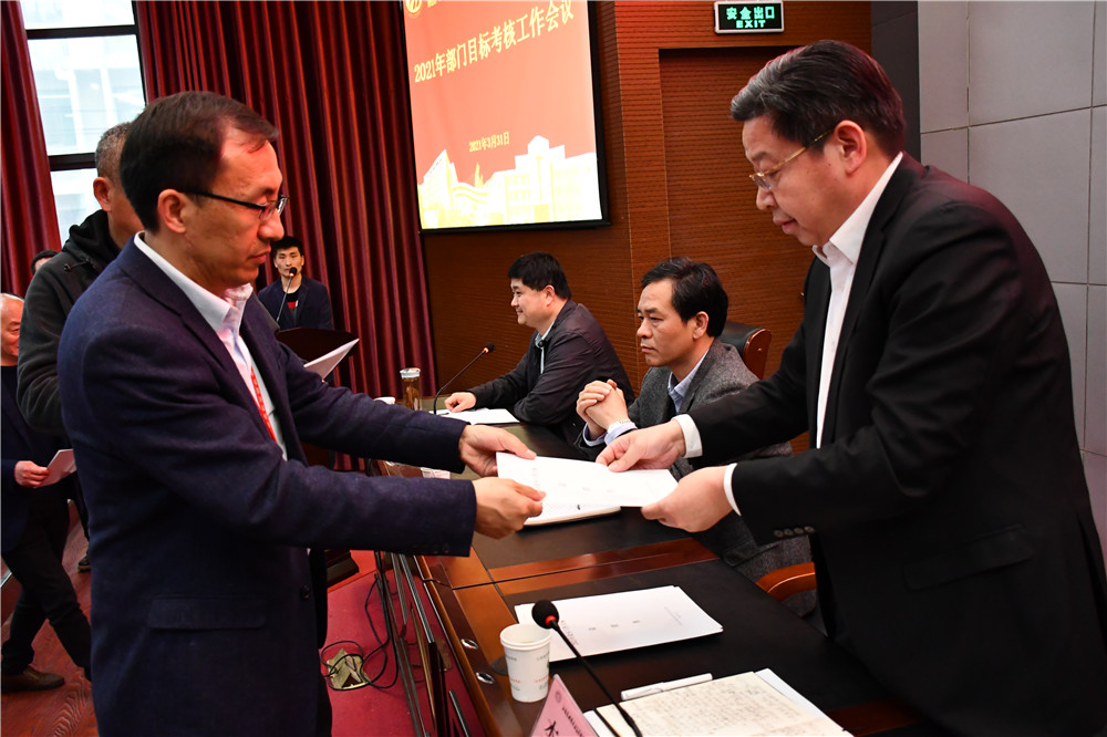 會上,各部門主要負責人向學校主要領導遞交2021年度目標考核責任書。教務處、機電工程學院負責人交流發(fā)言。