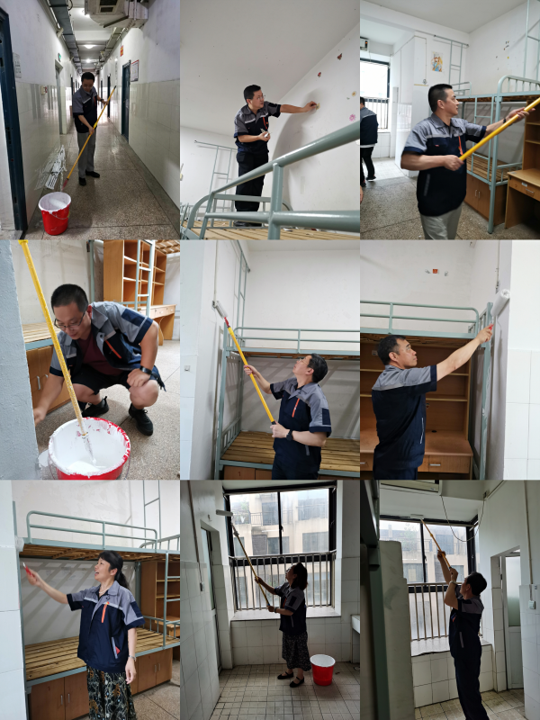 7月12日開(kāi)始,后勤管理處聯(lián)合銀城物業(yè)30余人,進(jìn)行清理墻面,粉刷墻,打掃衛(wèi)生等分工安排。施工期間,學(xué)校領(lǐng)導(dǎo)深入學(xué)生宿舍區(qū),檢查學(xué)生宿舍改造及配套設(shè)施建設(shè)進(jìn)展情況,并一起參加粉刷活動(dòng)。經(jīng)大家共同努力于7月17圓滿完成344間學(xué)生宿舍的墻面粉刷工作。