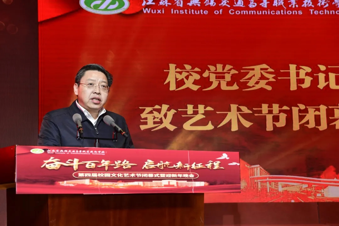 會(huì)上,李虎書(shū)記致第四屆校園文化藝術(shù)節(jié)閉幕式暨2022年新年賀詞。2021年,全校師生把黨史學(xué)習(xí)教育與高質(zhì)量發(fā)展融會(huì)貫通,在偉大建黨精神的鼓舞下,搶抓機(jī)遇,攻堅(jiān)克難,學(xué)校升格已納入《江蘇省“十四五”綜合交通運(yùn)輸體系職業(yè)教育發(fā)展專(zhuān)項(xiàng)規(guī)劃》和無(wú)錫市“十四五”教育規(guī)劃中,已提請(qǐng)列入省“十四五”高校設(shè)置規(guī)劃,高質(zhì)量編制學(xué)?!笆奈濉币?guī)劃,確立“15610”發(fā)展戰(zhàn)略。他希望全校師生在2022年,要以習(xí)近平新時(shí)代中國(guó)特色社會(huì)主義思想為指導(dǎo),落實(shí)立德樹(shù)人之本,勇?lián)鐣?huì)服務(wù)之責(zé),以高質(zhì)量發(fā)展為主題,以高職院建設(shè)為主線(xiàn),以改革創(chuàng)新為動(dòng)力,以廳市共建創(chuàng)新發(fā)展為抓手,全面開(kāi)啟高職院建設(shè)新征程,譜寫(xiě)高質(zhì)量發(fā)展新篇章,以?xún)?yōu)異成績(jī)迎接黨的二十大召開(kāi)。