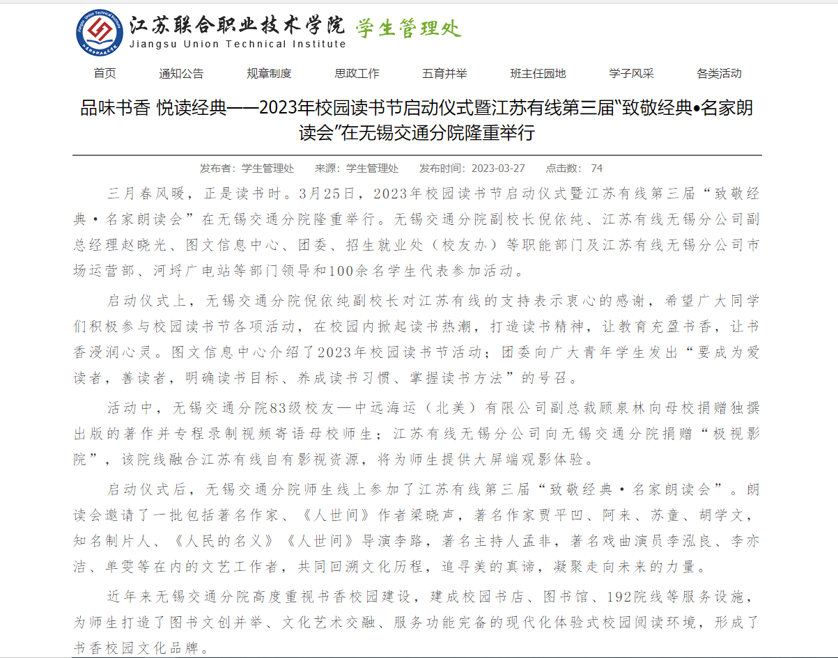 江蘇聯(lián)合職業(yè)技術(shù)學(xué)院官網(wǎng):2023年校園讀書節(jié)啟動(dòng)儀式暨江蘇有線第三屆“致敬經(jīng)典?名家朗讀會(huì)”在無錫交通分院隆重舉行