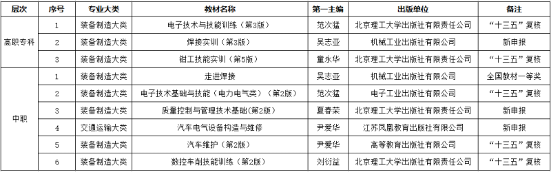 近日,教育部公示擬入選首批“十四五”職業(yè)教育國家規(guī)劃教材名單,學(xué)校教師主編的9部教材入選首批“十四五”職業(yè)教育國家規(guī)劃教材。其中新申報(bào)教材入選3部教材,“十三五”復(fù)核教材入選6部教材,具體入選名單見下表: