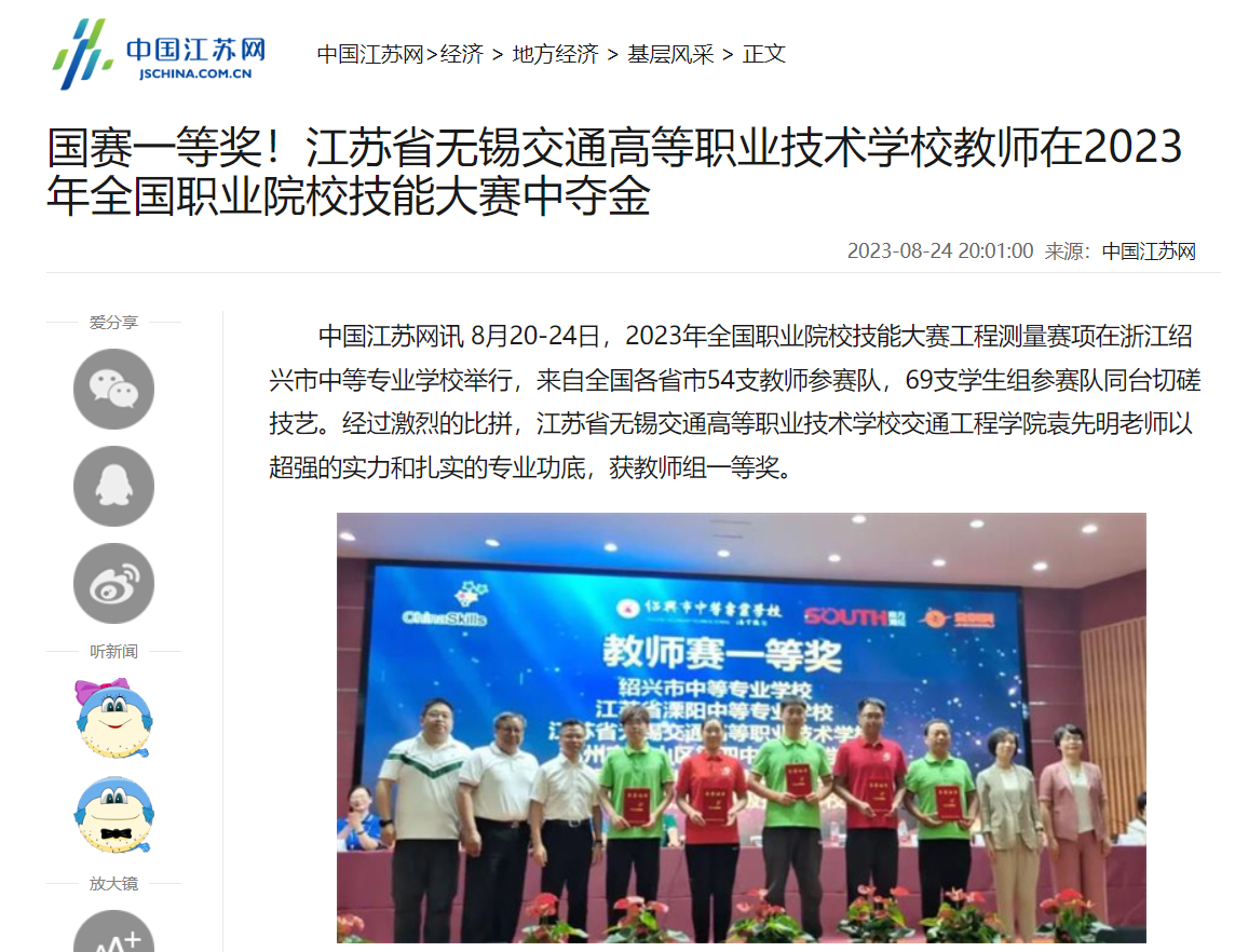中江網(wǎng):國賽一等獎!江蘇省無錫交通高等職業(yè)技術(shù)學(xué)校教師在2023年全國職業(yè)院校技能大賽中奪金