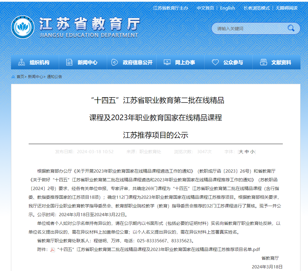 近日,江蘇省教育廳公示了“十四五”江蘇省職業(yè)教育第二批在線精品課程及2023年職業(yè)教育國(guó)家在線精品課程江蘇推薦項(xiàng)目名單,學(xué)校2門(mén)課程被確定為“十四五”江蘇省職業(yè)教育第二批在線精品課程,2門(mén)課程為2023年職業(yè)教育國(guó)家在線精品課程江蘇推薦項(xiàng)目。