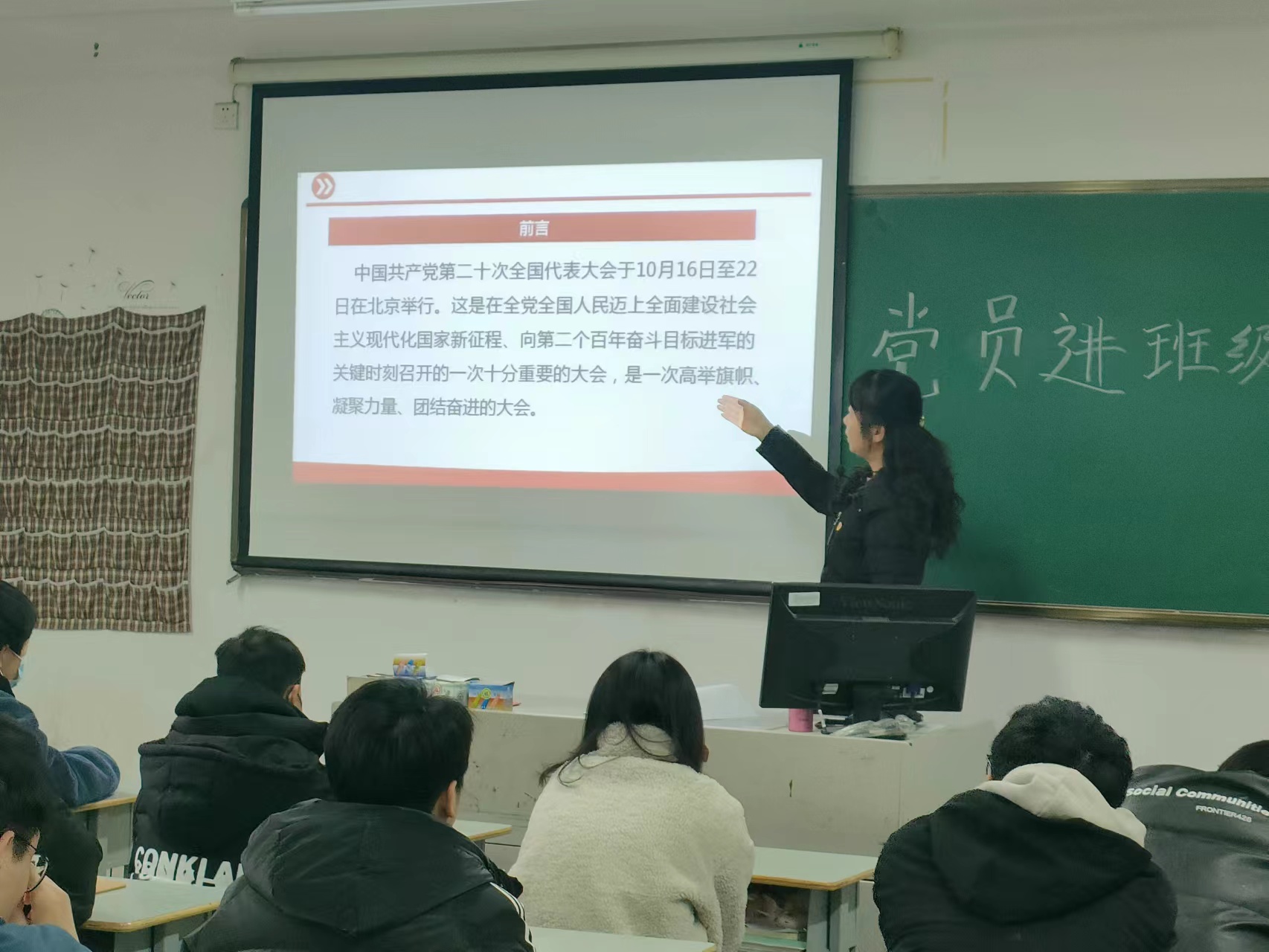隨后,邵敏珠介紹了黨的二十大盛況和黨的二十大報告主要精神,重點圍繞黨的二十大報告主題、主要成果等方面做了介紹,同時分享了自己學習黨的二十大精神的感悟,內(nèi)容生動豐富、語言通俗易懂,使全班學生對黨的二十大精神有了更加全面、更加深入的認識和把握。