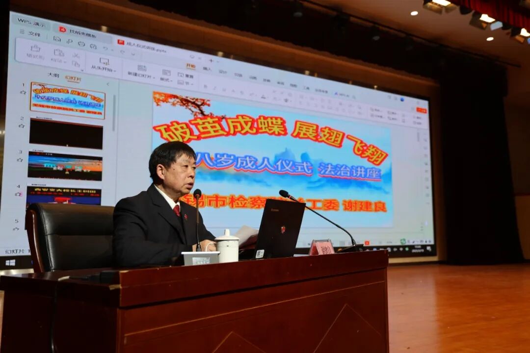 學校聘任無錫市檢察院關工委法治宣講員謝建良為校外法治輔導員,強化青少年法治教育,為成長保駕護航。最后,謝建良檢察官以《破繭成蝶 展翅飛翔》為主題作精彩分享,從法治視角解析青年成長路徑,鼓勵學生突破舒適區(qū),在時代浪潮中勇立潮頭。