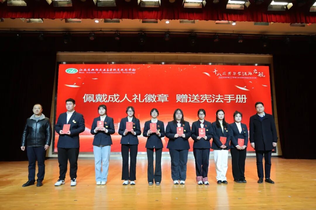 盛姣老師從職業(yè)教育使命出發(fā),勉勵學生“把握學歷提升機遇,在技能報國之路上行穩(wěn)致遠”。校友代表薛子駿結合自身成長經(jīng)歷,分享“終身學習”的重要性,引發(fā)共鳴。傣族舞《喜水》以靈動舞姿為儀式注入青春活力,彰顯多元校園文化。 在莊重的成人禮環(huán)節(jié),教務處、學生工作處教師為學子佩戴成人禮徽章并贈送憲法手冊,象征法律賦予的權利與義務。張龍枝老師帶領全體學生面向國旗宣誓,誓言錚錚,回蕩禮堂。