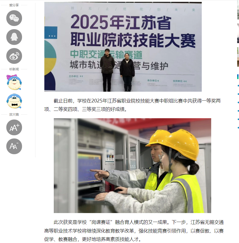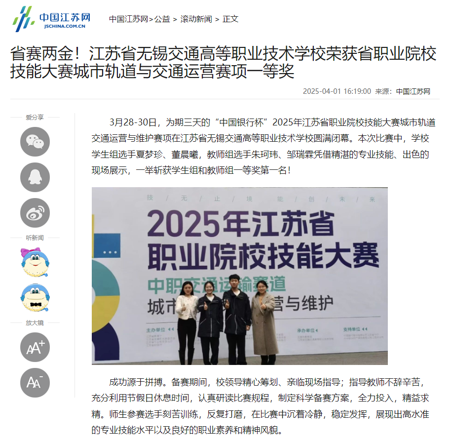 中江網(wǎng):省賽兩金!江蘇省無(wú)錫交通高等職業(yè)技術(shù)學(xué)校榮獲省職業(yè)院校技能大賽城市軌道與交通運(yùn)營(yíng)賽項(xiàng)一等獎(jiǎng)