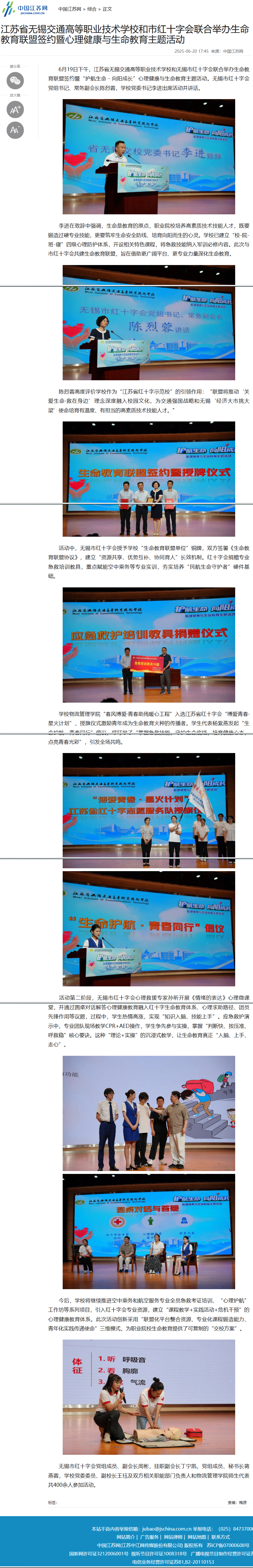 中江網(wǎng):江蘇省無錫交通高等職業(yè)技術(shù)學(xué)校和市紅十字會(huì)聯(lián)合舉辦生命教育聯(lián)盟簽約暨心理健康與生命教育主題活動(dòng)