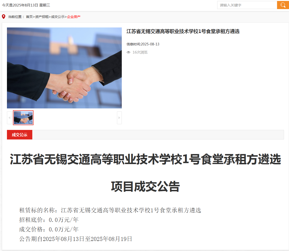 江蘇省無錫交通高等職業(yè)技術(shù)學(xué)校1號(hào)食堂承租方遴選項(xiàng)目成交公告