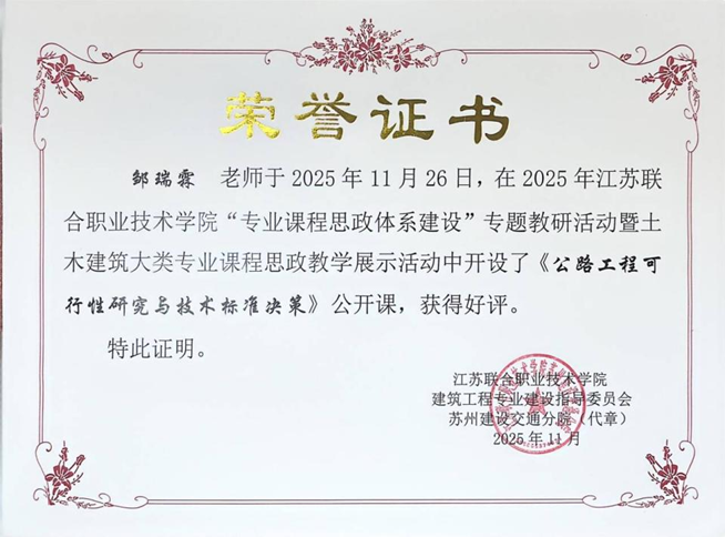 1126日,江蘇聯(lián)合職業(yè)技術(shù)學(xué)院“專(zhuān)業(yè)課程思政體系建設(shè)”專(zhuān)題教研活動(dòng)暨土木建筑大類(lèi)專(zhuān)業(yè)課程思政教學(xué)展示在江蘇省交通技師學(xué)院舉行。交通工程學(xué)院鄒瑞霖老師主講《公路工程可行性研究與技術(shù)標(biāo)準(zhǔn)決策》公開(kāi)課。