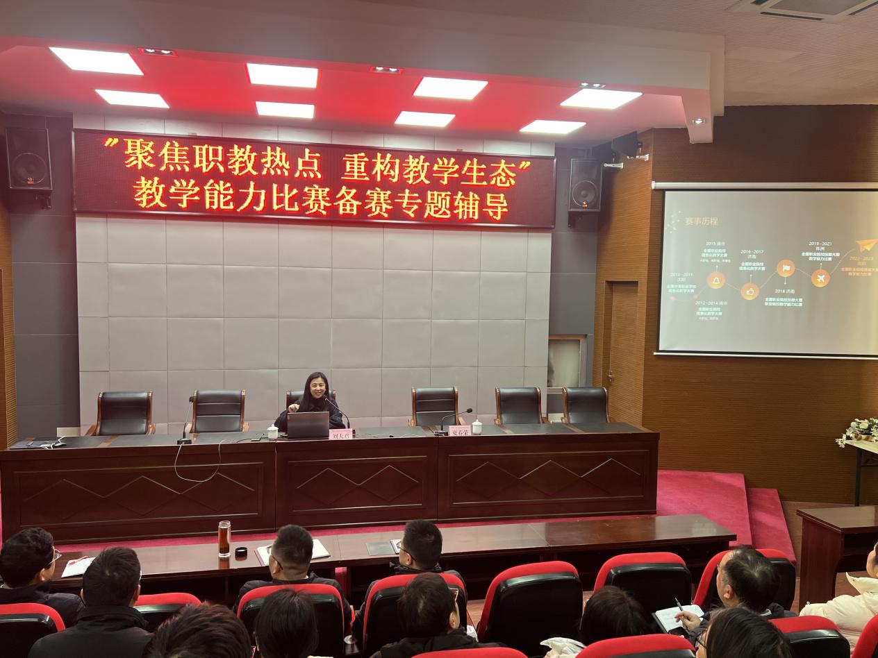 為深化教育教學(xué)改革,精準(zhǔn)把握職教發(fā)展趨勢(shì),助力教師高效備賽教學(xué)能力比賽,1月22日,我校成功舉辦“聚焦職教熱點(diǎn) 重構(gòu)教學(xué)生態(tài)”備賽專(zhuān)題輔導(dǎo)活動(dòng)。活動(dòng)特邀江蘇城鄉(xiāng)建設(shè)職業(yè)學(xué)院設(shè)備工程學(xué)院院長(zhǎng)劉大君教授主講,全校各院部教學(xué)領(lǐng)導(dǎo)、參賽團(tuán)隊(duì)教師及各教研室教師代表齊聚,共探職教革新與備賽要點(diǎn)。