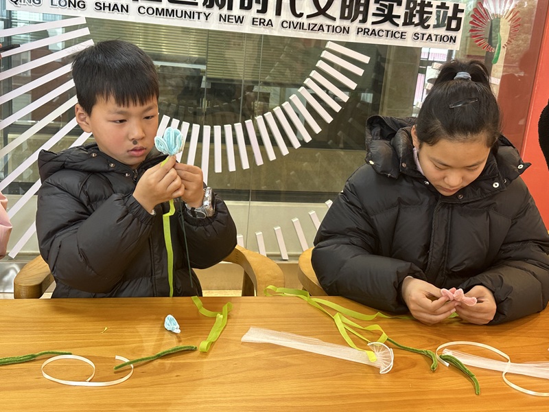 在最令人期待的手作體驗(yàn)環(huán)節(jié),“制作你的第一朵絨花”成為現(xiàn)場(chǎng)的核心主題,孩子們興致勃勃地拿起提前準(zhǔn)備好的彩色蠶絲線、細(xì)軟銅絲等工具,在志愿者的指導(dǎo)下,現(xiàn)場(chǎng)暖意融融、童趣盎然,孩子們專注地投入到手作中,時(shí)不時(shí)互相展示自己的半成品,歡聲笑語(yǔ)不斷。一根根彩色絨條在孩子們的指尖漸漸“綻放”成形態(tài)各異的絨花,每一朵都承載著孩子們的童真與用心,也寄托著對(duì)美好童年的向往。