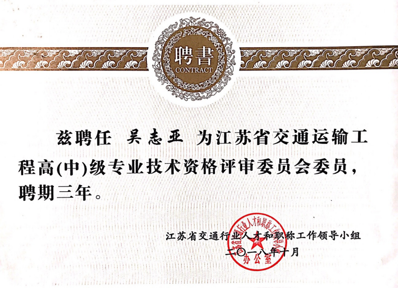 江蘇省交通運(yùn)輸工程高(中)級(jí)專(zhuān)業(yè)技術(shù)資格評(píng)審委員會(huì)委員;
