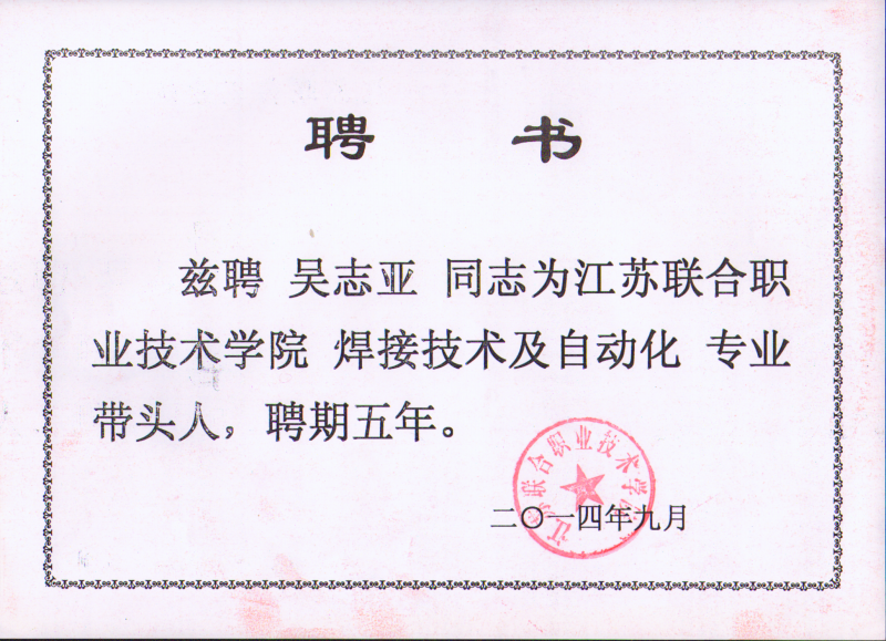 江蘇聯(lián)合職業(yè)技術(shù)學(xué)院焊接技術(shù)及自動(dòng)化專(zhuān)業(yè)帶頭人