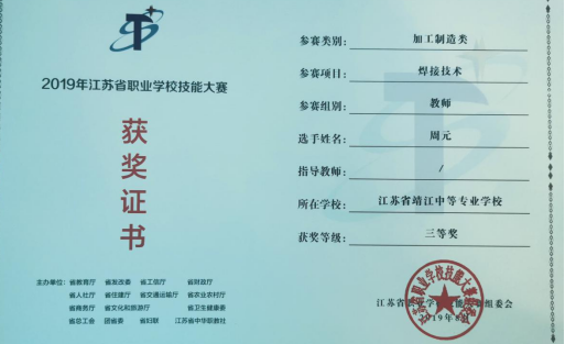 江蘇省職業(yè)學(xué)校焊接技能大賽教師組三等獎