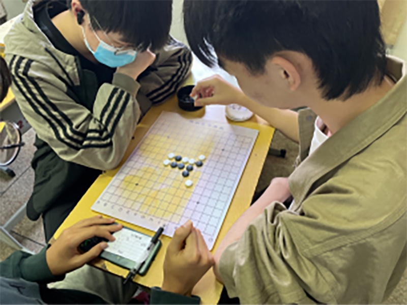 此次比賽的宗旨是以棋會友,其樂無窮。為了比賽的公平性和競技性,此次比賽采取抽簽分組,三局兩勝選出晉級選手,再進行決賽。每個星期三下午班會課后開始進行比賽,比賽現(xiàn)場井然有序,氣氛歡樂。比賽開始后,棋盤上大家都不謙虛,你來我往,招招逼人,稍有不慎,便會全盤皆輸。各參賽選手均全神貫注,力爭勝利。黑白棋子之間不斷的變換,碰撞出智慧的火花,比賽結束后,大家仍然不忘交流比賽心得,互補長短。