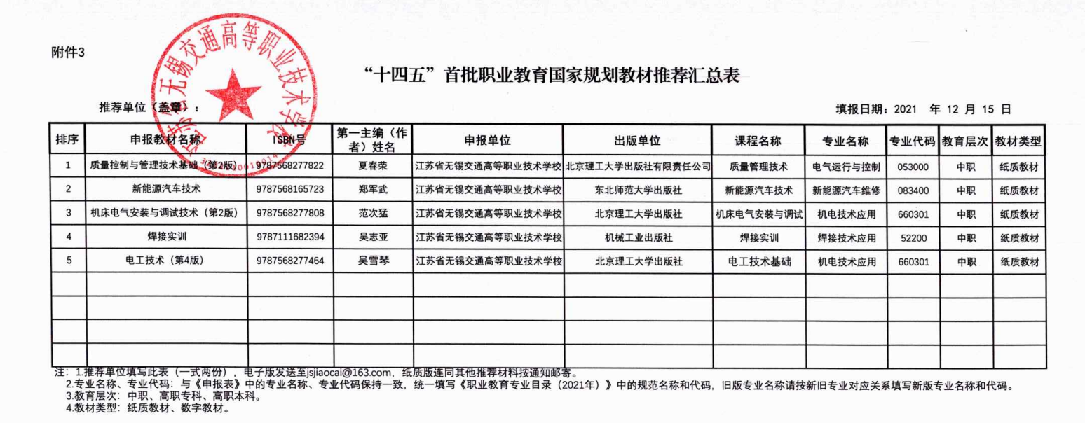 根據(jù)《省教育廳關(guān)于開(kāi)展“十四五”首批職業(yè)教育國(guó)家規(guī)劃教材申報(bào)推薦工作的通知》學(xué)校擬推薦以下五本教材,現(xiàn)予以公示。