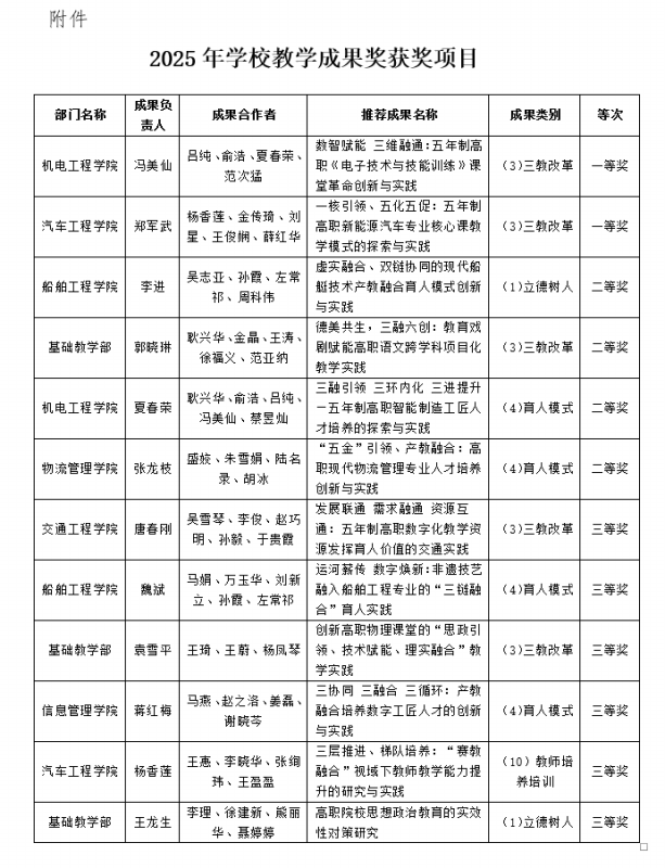 根據(jù)學?!蛾P(guān)于開展2025年教學成果獎評選工作的通知》,學校啟動了2025年教學成果獎的申報工作,共收到各部門的申報成果12項。經(jīng)教學工作委員會專家評審,校務(wù)會審定,《數(shù)智賦能 三維融通:五年制高職《電子技術(shù)與技能訓練》課堂革命創(chuàng)新與實踐》等2項成果為校級一等獎,《虛實融合、雙鏈協(xié)同的現(xiàn)代船艇技術(shù)產(chǎn)教融合育人模式創(chuàng)新與實踐》等4項成果為校級二等獎,《發(fā)展聯(lián)通 需求融通 資源互通:五年制高職數(shù)字化教學資源發(fā)揮育人價值的交通實踐》等6項成果為校級三等獎,現(xiàn)予以公示。