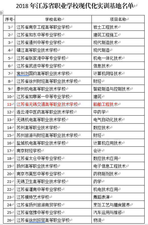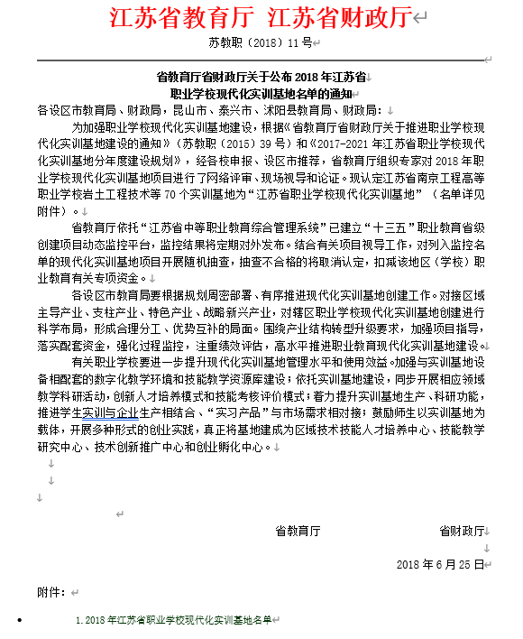 省教育廳省財政廳關(guān)于公布2018年江蘇省現(xiàn)代化實訓(xùn)基地名單的通知