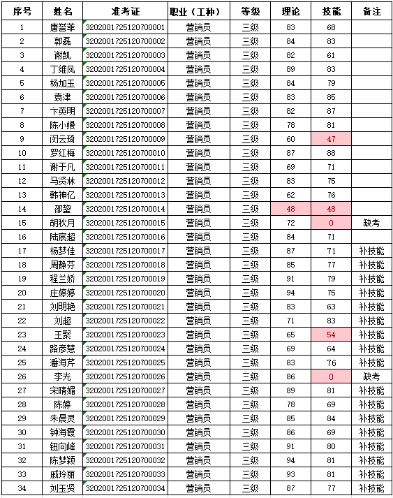 2025年12月7日,34名企業(yè)人員參加營銷員三級技能等級認定考試(考試批次:2025-32020017-00048),共計29名成績獲得合格。現將考試成績公示如下: