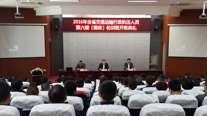 ????? 4月19日上午,2016年全省交通運(yùn)輸行政執(zhí)法人員第六期(路政)輪訓(xùn)班開班典禮在我校錢榮校區(qū)學(xué)術(shù)報(bào)告廳舉行,我校黨委李虎書記、無錫市公路管理處談軍偉處長、無錫市交通運(yùn)輸局政策法規(guī)處馮濤處長等領(lǐng)導(dǎo)出席開班典禮。