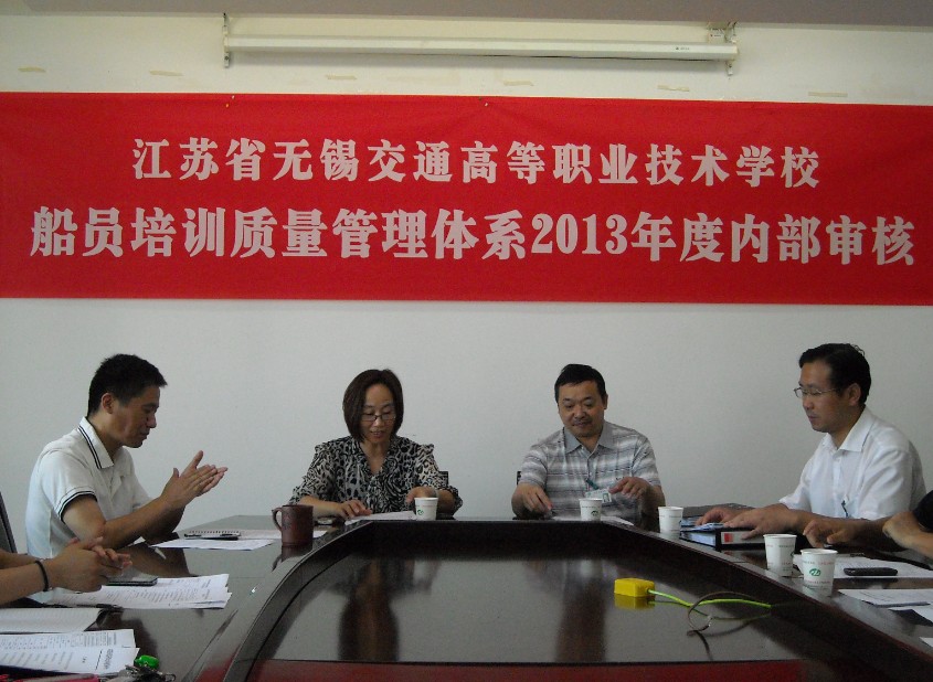 ??????? 2013年7月23日至24日,江蘇省無錫交通高等職業(yè)技術(shù)學(xué)校船員培訓(xùn)質(zhì)量管理體系2013年度內(nèi)部審核會(huì)議在我校錢榮校區(qū)綜合樓三樓會(huì)議室順利召開。南通航運(yùn)職業(yè)技術(shù)學(xué)院成教院院長(zhǎng)范育軍,江蘇省航海學(xué)會(huì)副秘書長(zhǎng)、南通航院質(zhì)管辦副主任王彬,我校副校長(zhǎng)、船員培訓(xùn)中心主任朱雨蘭,繼續(xù)教育部主任、船員培訓(xùn)中心副主任薛剛云以及船員培訓(xùn)質(zhì)量管理體系各受控部門人員參加了會(huì)議。