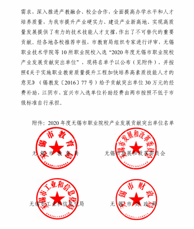 12月8日,無錫市教育局發(fā)布了《關(guān)于公布無錫市職業(yè)院校促進(jìn)產(chǎn)業(yè)發(fā)展貢獻(xiàn)突出單位名單的通知》(錫教發(fā)〔2020〕101號(hào)),我校獲評(píng)“2020年度無錫市職業(yè)院校促進(jìn)產(chǎn)業(yè)發(fā)展貢獻(xiàn)突出單位”,并獲30萬補(bǔ)助。