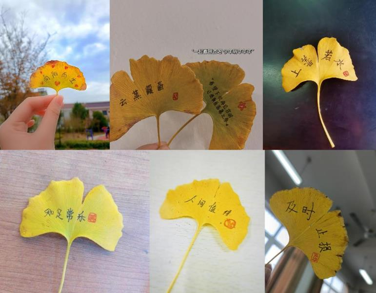 活動中,社員們每人至少一片葉子,寫之前用濕巾把樹葉擦拭干凈,壓平不平整的樹葉,在樹葉上寫完字后,同學(xué)們還手繪了印章,作成書簽,該書簽又名秋葉箋。同學(xué)們制作的書簽可自用,也可送人。每一片秋葉箋,都寄托著同學(xué)們對生活的體悟和對人生的信仰。有的同學(xué)寫“天生我材必有用”,有的寫“知足常樂”,也有同學(xué)寫“上善若水”“立言立行”等等。