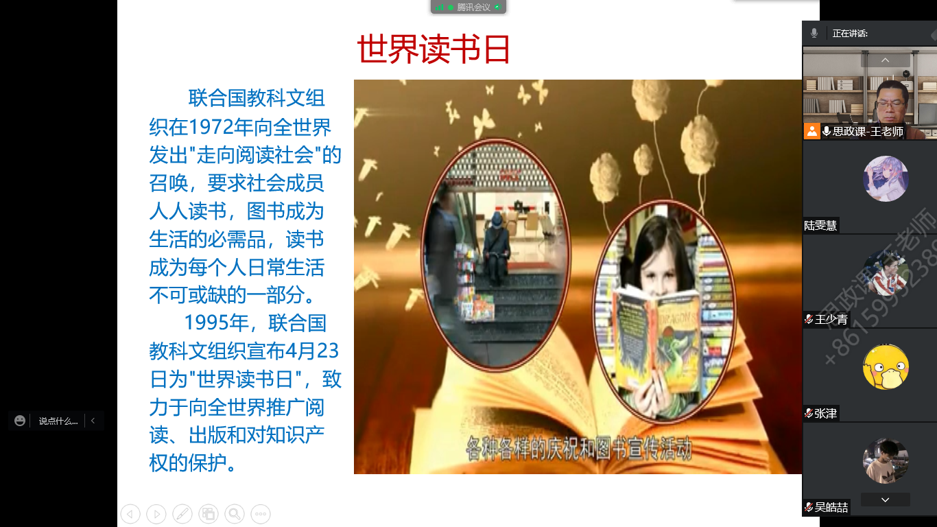最后,王老師在線上與社團成員一起交流了讀書的方法與心得,并且希望社團成員們能夠趁年輕時多讀書、讀好書,養(yǎng)成愛讀書的好習(xí)慣,不僅在“世界讀書日”要讀書,而且應(yīng)該把讀書的好習(xí)慣融入到生活中的每一天!
