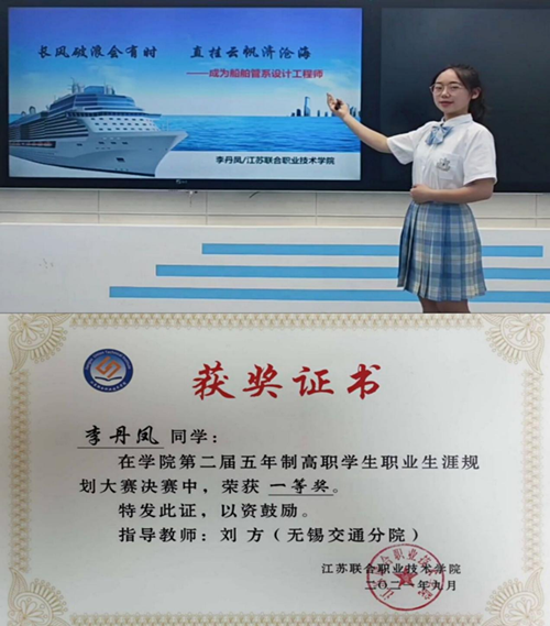她擔任著學院181121(41)班團支部書記,充分發(fā)揮新時代勇于創(chuàng)業(yè)、敢于創(chuàng)新、善于創(chuàng)優(yōu)的“三創(chuàng)”精神,積極參加學校的各類活動,2021年9月,在江蘇聯合職業(yè)技術學院第二屆五年制高職學生職業(yè)生涯規(guī)劃決賽中,榮獲一等獎。