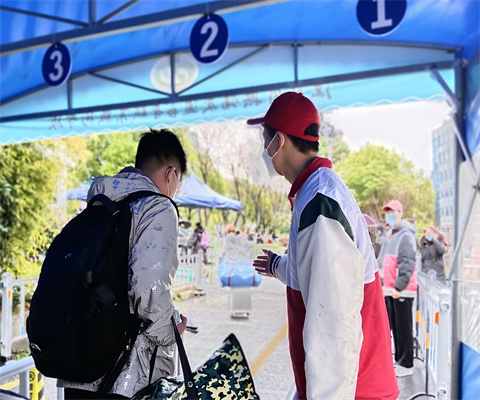返校當(dāng)天,疫情防控志愿者們身穿紅馬甲,早早來(lái)到各自的工作地點(diǎn)集合,開(kāi)始了全天的志愿服務(wù)。“同學(xué),請(qǐng)這邊走”“同學(xué),請(qǐng)測(cè)體溫”……他們或?yàn)閷W(xué)生搬運(yùn)行李、或引導(dǎo)學(xué)生有序進(jìn)校、或進(jìn)行文明引導(dǎo),用滿腔的熱血和溫暖的笑顏迎接一批批從各地返校的同學(xué),用實(shí)際行動(dòng)為同學(xué)返校暖心護(hù)航。