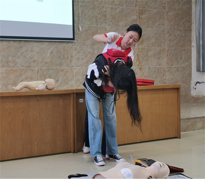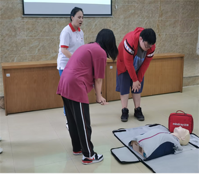 活動(dòng)初始,紅十字會(huì)培訓(xùn)老師向師生們介紹了紅十字會(huì)的起源發(fā)展、工作職責(zé)、標(biāo)志及“人道、博愛、奉獻(xiàn)”的紅十字會(huì)精神,使同學(xué)們對紅十字會(huì)有了初步了解。隨后,紅十字會(huì)培訓(xùn)老師結(jié)合理論知識(shí)和實(shí)際救護(hù)技巧對生活中遇到突發(fā)狀況急救、徒手心肺復(fù)蘇、溺水緊急救護(hù)等內(nèi)容作了詳細(xì)的講解。為了使師生們更加深入的了解各項(xiàng)救護(hù)技巧、掌握心肺復(fù)蘇要領(lǐng)、培訓(xùn)老師和師生們在現(xiàn)場展開了深入互動(dòng),對心肺復(fù)蘇進(jìn)行了實(shí)操演練、手把手向同學(xué)們傳授了急救手法和注意事項(xiàng)。
