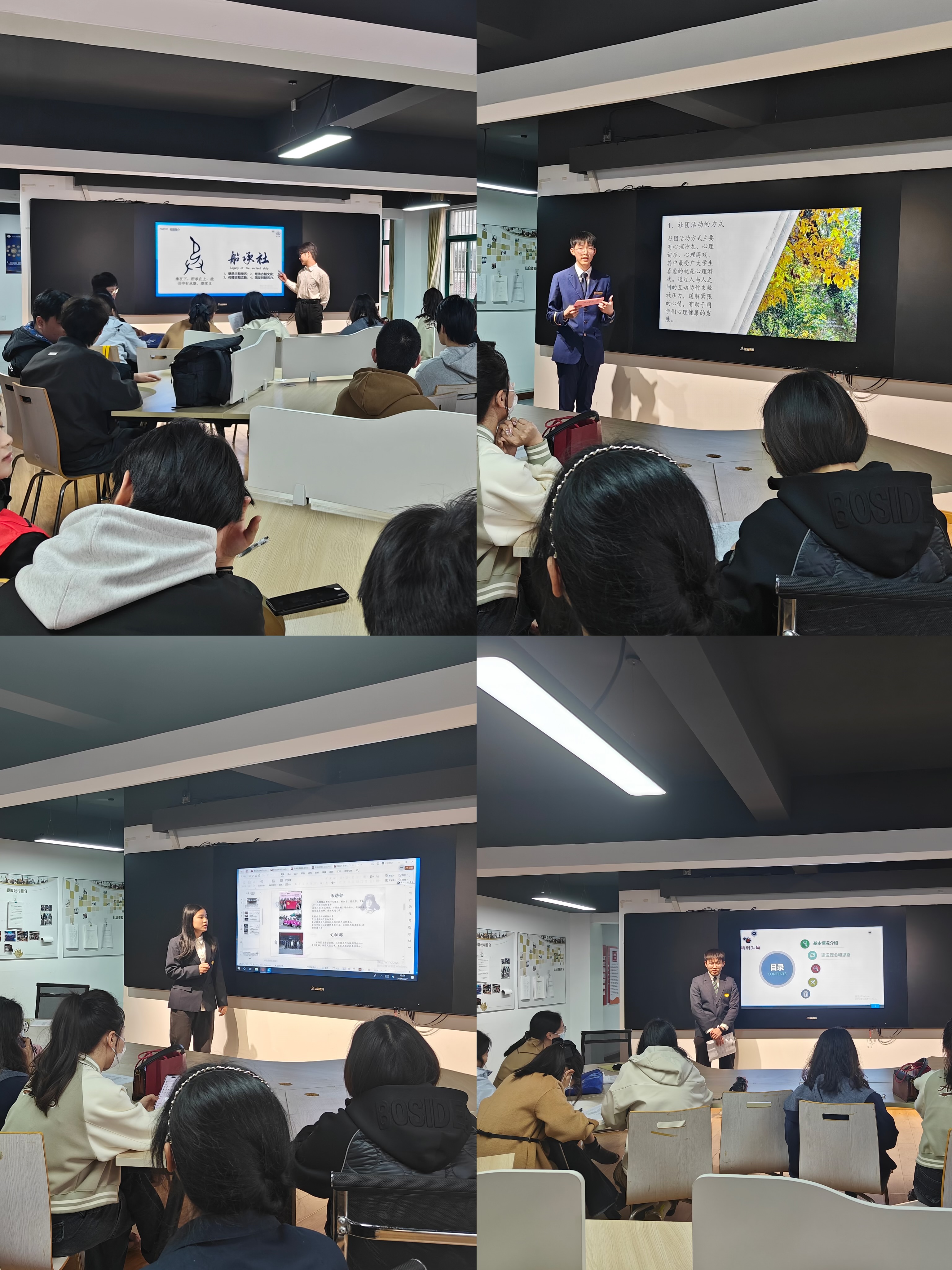 前期經(jīng)社團(tuán)申報(bào)、校團(tuán)委審核,產(chǎn)生了20個優(yōu)秀學(xué)生社團(tuán)的候選集體。答辯現(xiàn)場,各參評社團(tuán)代表在5分鐘的答辯時間內(nèi),運(yùn)用PPT、視頻、現(xiàn)場展示等形式,匯報(bào)社團(tuán)過去一年的風(fēng)采與成果,并對社團(tuán)的未來發(fā)展作出展望,內(nèi)容詳實(shí)、主題突出、特色鮮明。