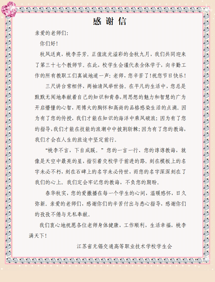桃李不言,下自成蹊。教師的諄諄教誨,讓學(xué)生們有了披荊斬棘、乘風(fēng)破浪的勇氣,校學(xué)生會代表全體學(xué)子發(fā)布了一封感謝信,感謝老師的辛苦付出與悉心指導(dǎo),感謝老師的孜孜不倦與無私奉獻(xiàn)。