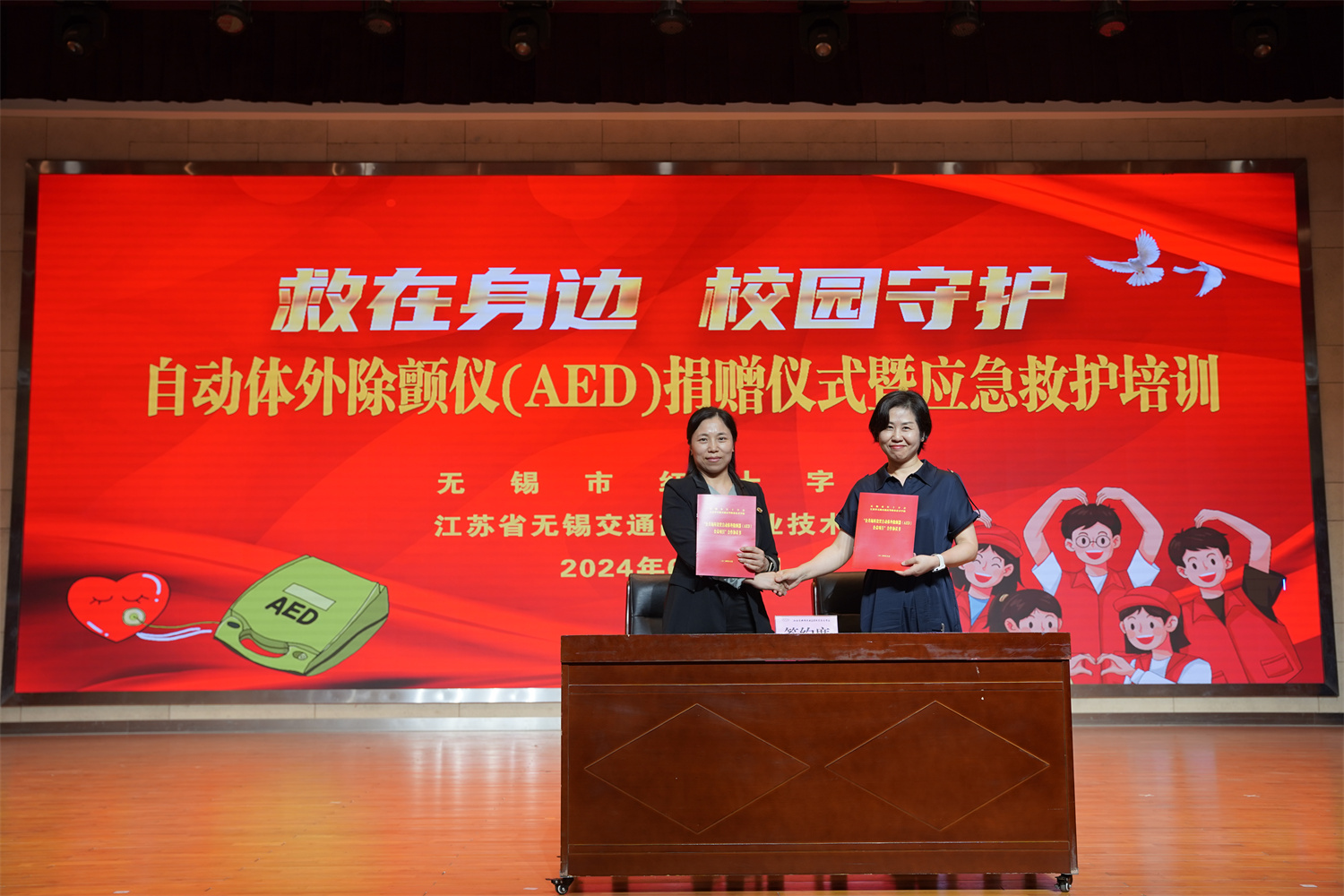 6月12日下午,“救在身邊,校園守護(hù)”自動體外除顫儀(AED)捐贈儀式暨應(yīng)急救護(hù)培訓(xùn)在學(xué)校大禮堂舉行。無錫市紅十字會黨組成員、副會長周彬,無錫市紅十字會賑濟(jì)救護(hù)部部長宋揚(yáng),學(xué)校黨委書記、校長李進(jìn)出席活動。儀式由校黨委委員、副校長吳雪琴主持。