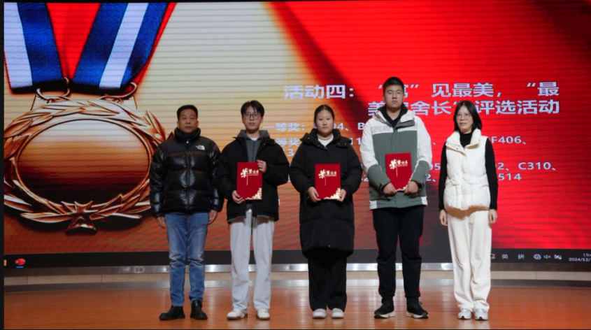12月11日下午,我校2024年“宿舍文化節(jié)”評比頒獎儀式暨宿舍長培訓講座在大禮堂舉行。學生工作處副處長籍鑫慧,后勤管理處宿舍負責人,銀城物業(yè)總經(jīng)理,各學院學工領導參加頒獎儀式,并為獲得獎項的寢室學生代表發(fā)獎狀和獎品。