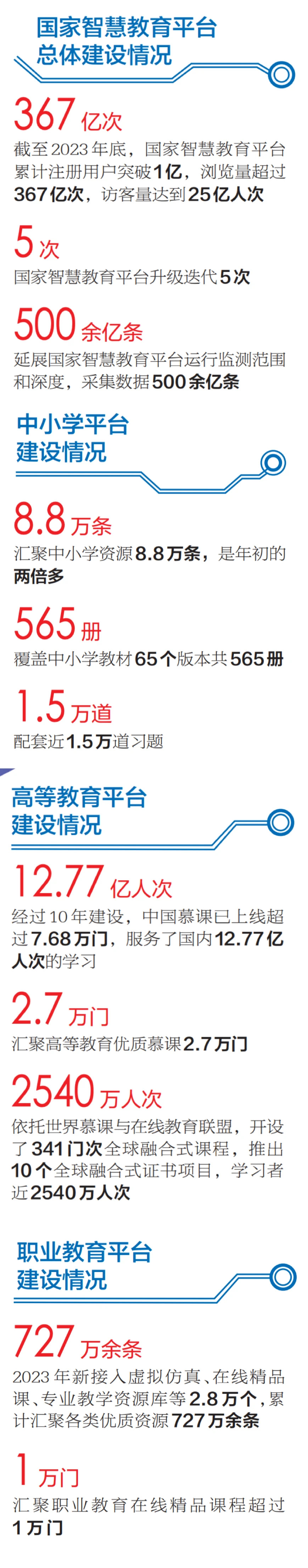 一組數(shù)據(jù)見證了我國教育數(shù)字化的蓬勃之勢:建成世界第一大教育教學資源庫,發(fā)布一系列教育數(shù)字化的標準規(guī)范,慕課建設(shè)和應(yīng)用規(guī)模成為世界第一……截至2023年底,國家智慧教育平臺累計注冊用戶突破1億,瀏覽量超過367億次,訪客量達25億人次,數(shù)字技術(shù)的疊加、倍增、溢出效應(yīng)充分顯現(xiàn)。