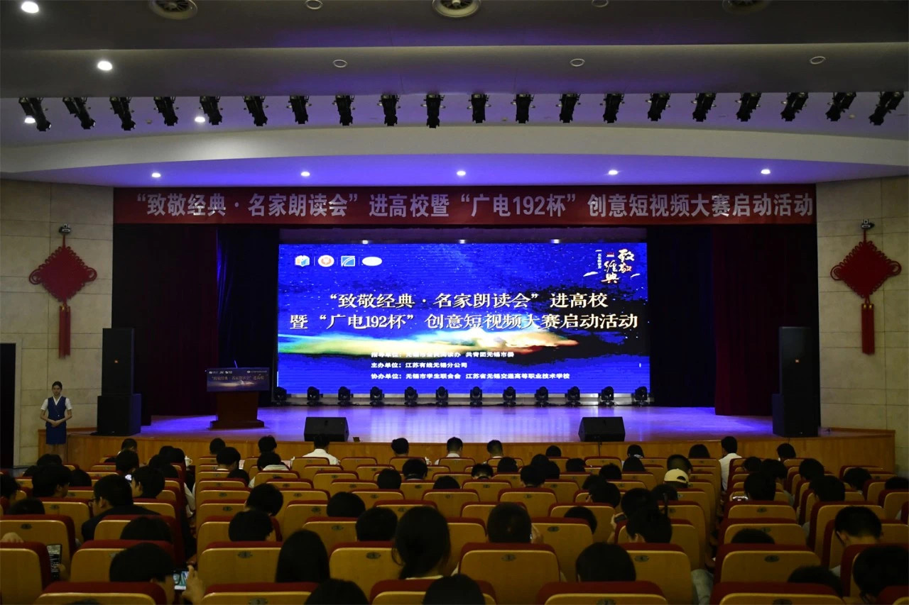 65日下午,一場(chǎng)別開生面的文化盛宴在學(xué)校大禮堂拉開帷幕。由江蘇有線無錫分公司主辦,無錫市學(xué)生聯(lián)合會(huì)、江蘇省無錫交通高等職業(yè)技術(shù)學(xué)校聯(lián)合承辦的致敬經(jīng)典·名家朗讀會(huì)進(jìn)高校暨廣電192創(chuàng)意短視頻大賽啟動(dòng)活動(dòng)在此成功舉辦。無錫市委宣傳部出版印刷發(fā)行處副處長(zhǎng)馮健,共青團(tuán)無錫市委學(xué)少部副部長(zhǎng)王裔,江蘇有線無錫分公司黨委委員、副總經(jīng)理趙曉光,校黨委委員、副校長(zhǎng)耿興華、王玨及在錫高校領(lǐng)導(dǎo)代表、江蘇有線無錫分公司代表、我校師生代表600余人共同參加了本次活動(dòng)。