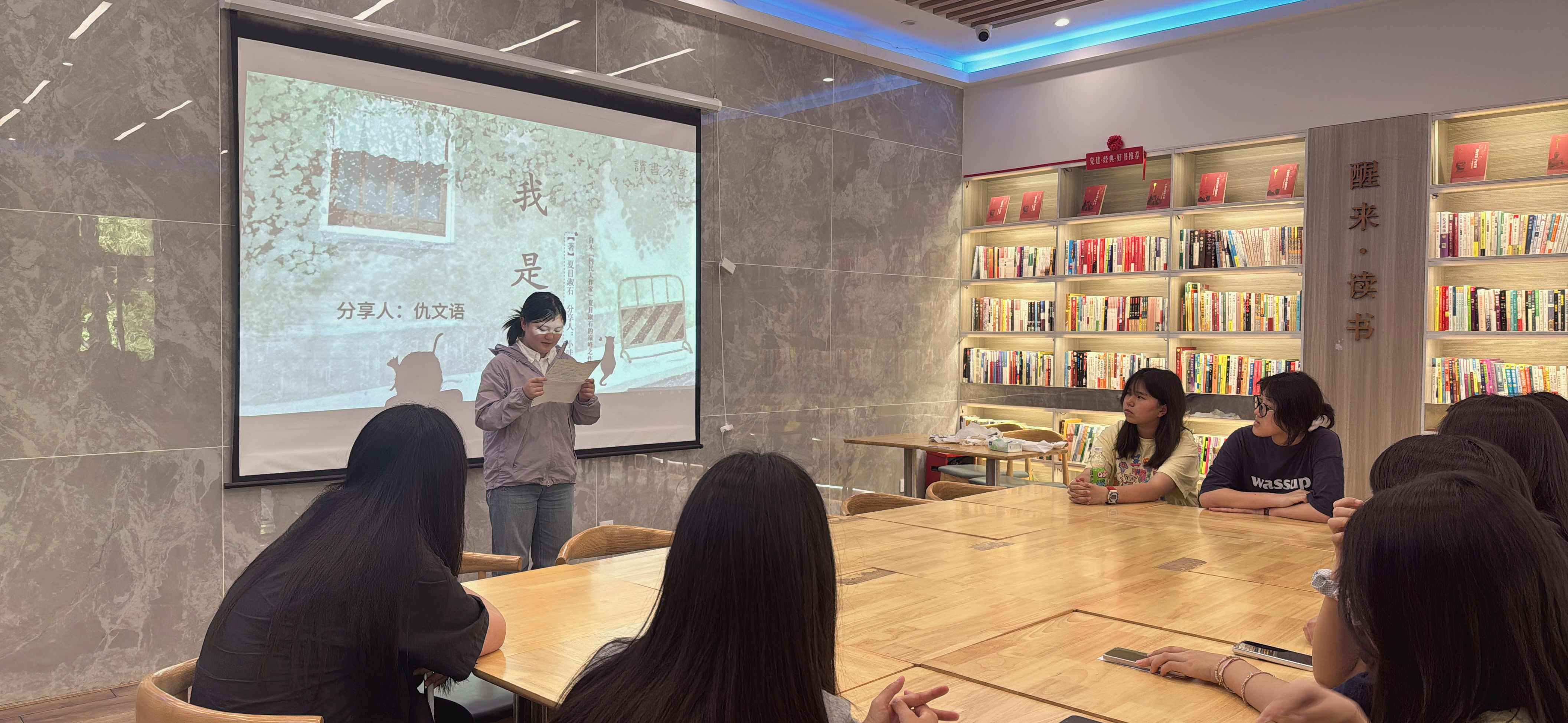 活動伊始,五位同學(xué)依次登臺分享閱讀感悟。其中,劉穎芝同學(xué)以高爾基的《童年》為切入點,剖析苦難中綻放的堅韌品格;余欣雨同學(xué)通過《平凡的世界》中孫少平的成長軌跡,詮釋“平凡人也可以活出崇高”的生命哲學(xué);高豫同學(xué)結(jié)合余華《活著》的生死命題,引發(fā)對生命韌性與存在意義的深刻思考;仇文語同學(xué)另辟蹊徑,借夏目漱石《我是貓》的詼諧視角,探討現(xiàn)代社會的人性百態(tài)。每場分享既有對文本的深度剖析,亦融入個性化的生活體悟,現(xiàn)場掌聲頻起。?